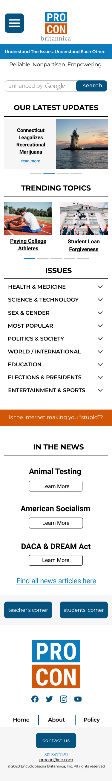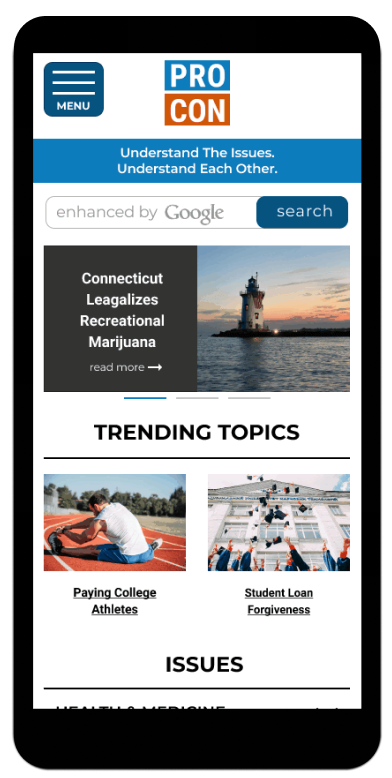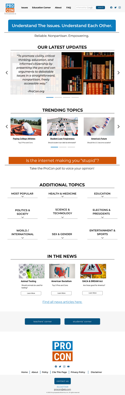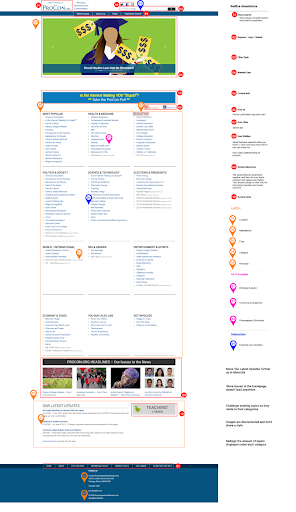 Users that visited ProCon.org were immediately met with confusion and frustration when browsing the site. This was caused by the layout and navigation used on the page. The site does not immediately offer the user a sense of trust and definition as to who ProCon.Org is as an organization.