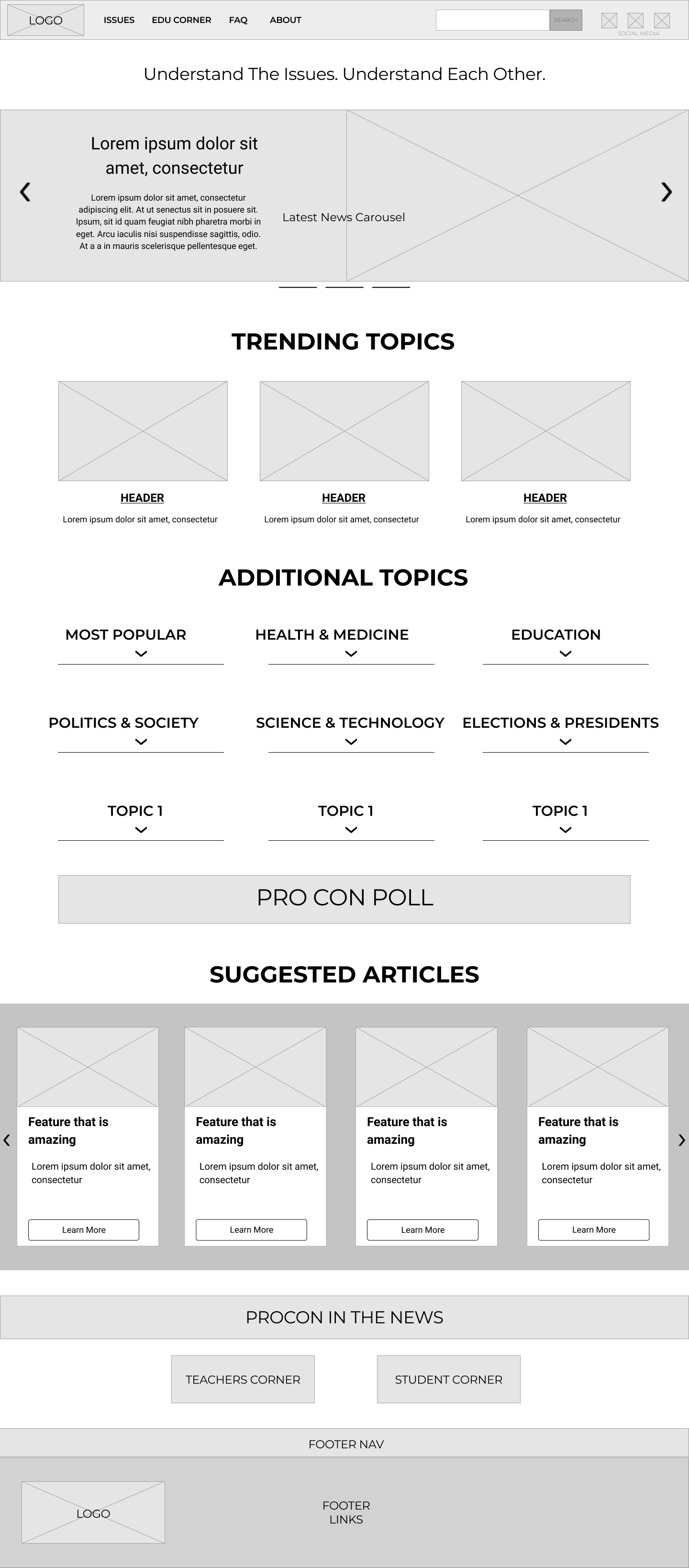 The aim of this project was to work with other bootcamp students in order to improve the usability of a site using the UX design process. We chose ProCon.org because it provides an important service in the current news media climate. It is an Encyclopedia site that provides users with a two sided look at popular and current topics.